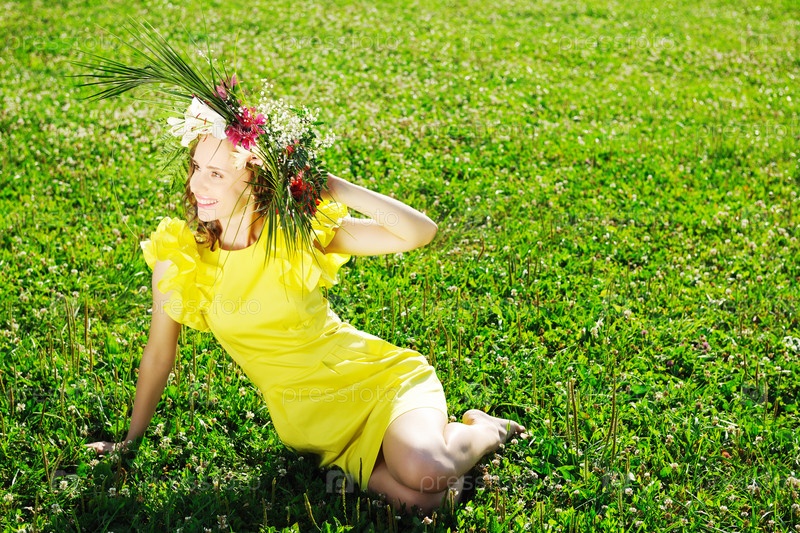Девушка в венке из цветов сидит на поляне