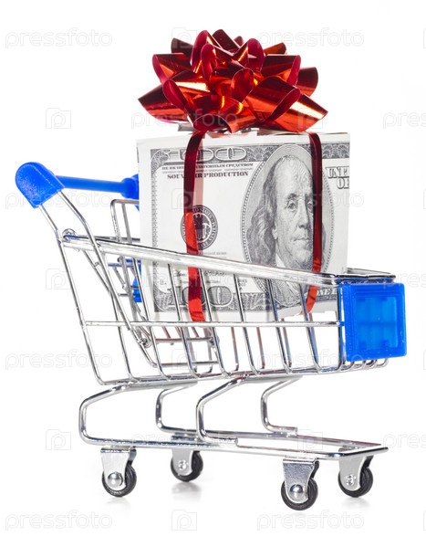Подарок в корзине для покупок на белом фоне