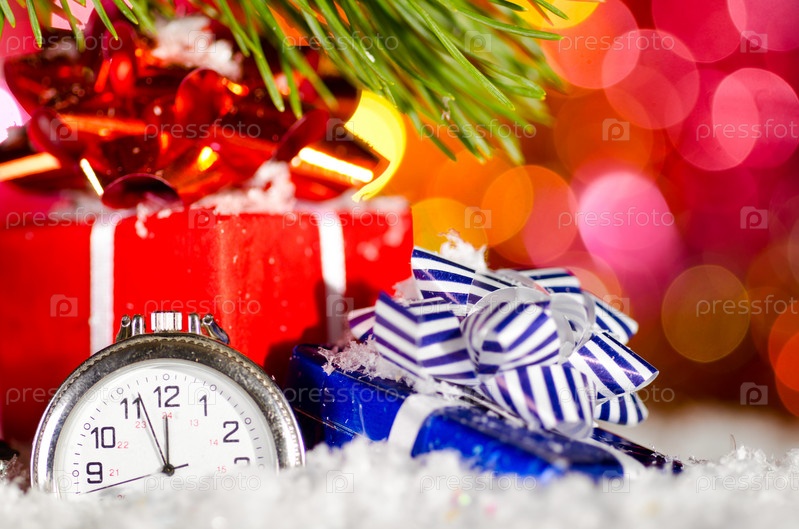 Подарки и часы в снегу