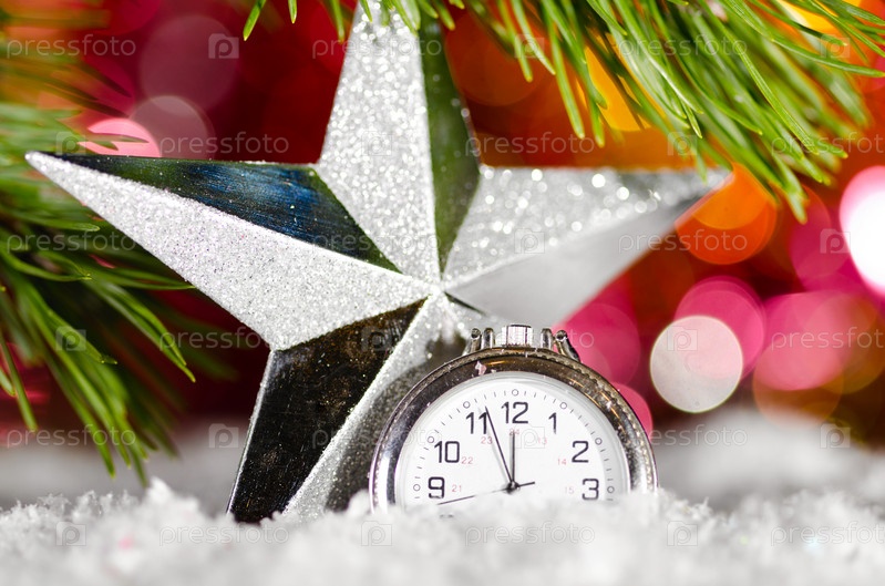 Новогодняя звезда и часы в снегу