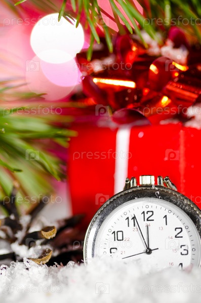 Подарок и часы в снегу