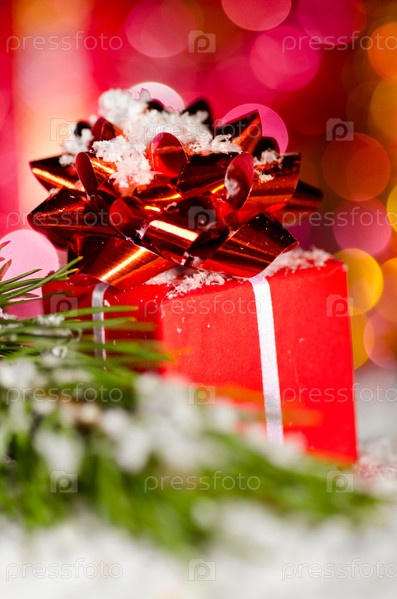 Подарок и елочная ветка в снегу