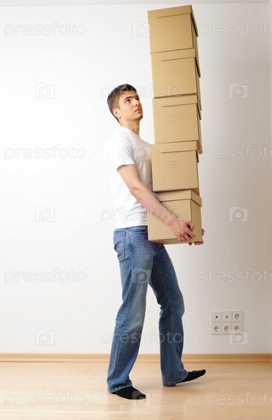 Молодой человек несет стопку коробок