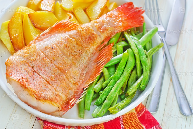 Жареная рыба, картофель и фасоль