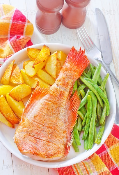 Жареная рыба, картофель и фасоль