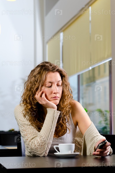 Молодая симпатичная женщина в кафе с чашкой кофе