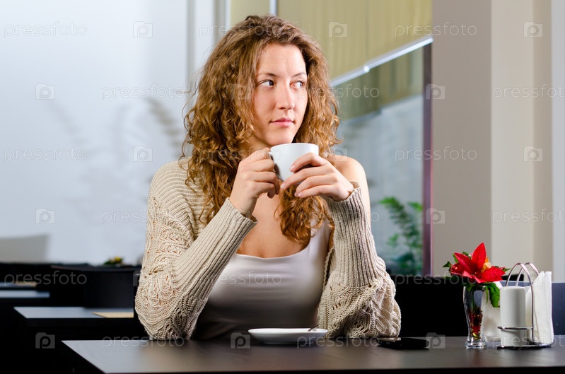 Молодая симпатичная женщина в кафе с чашкой кофе