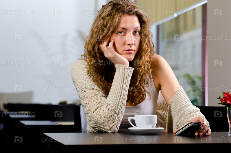 Молодая симпатичная женщина в кафе с чашкой кофе