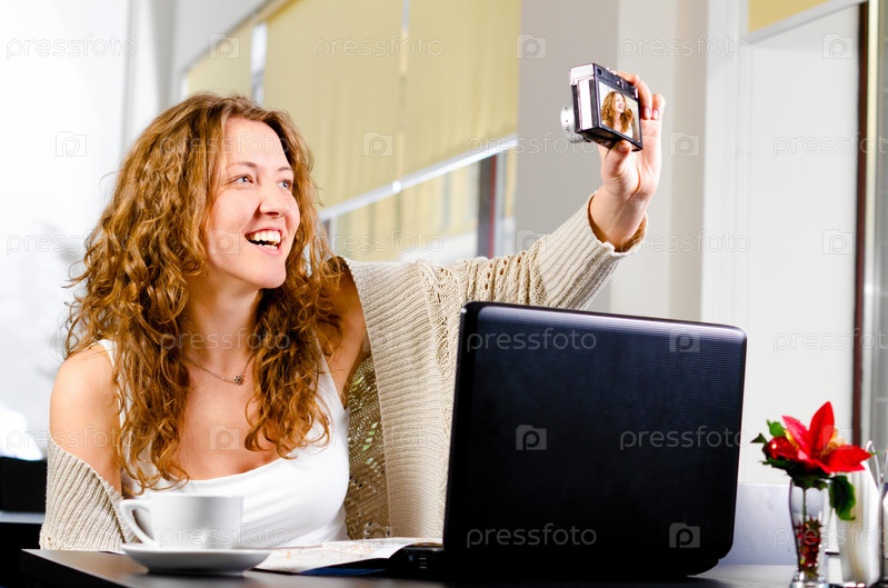 Молодая симпатичная женщина в кафе фотографирует себя