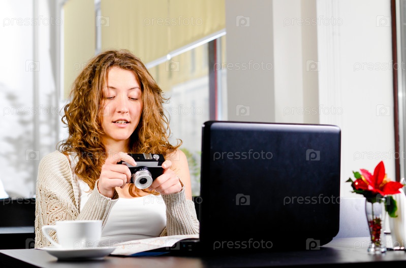 Молодая симпатичная женщина в кафе смотрит фотографии