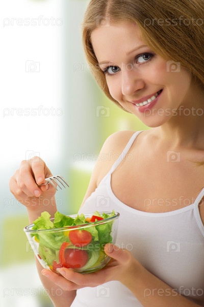Портрет красивой молодой женщины с овощным салатом