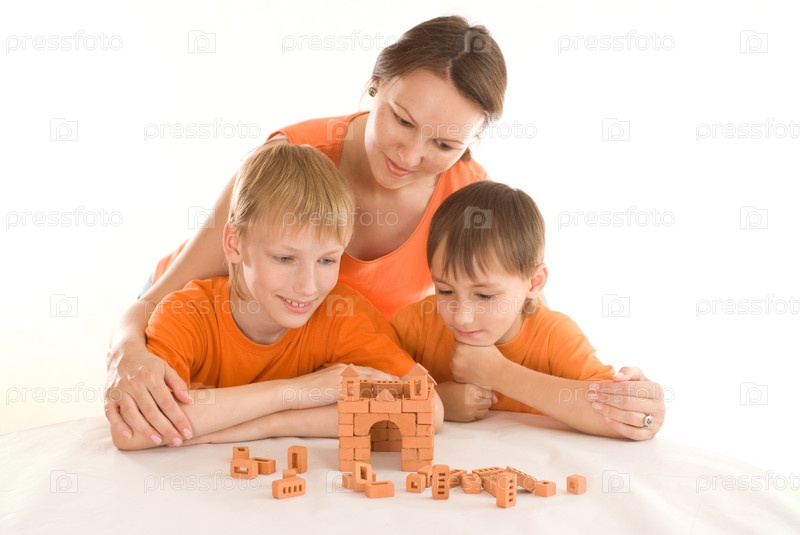 Мать с сыновьями собирают замок из конструктора
