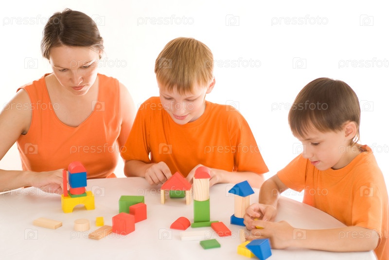 Мать с сыновьями собирают домики из элементов конструктора