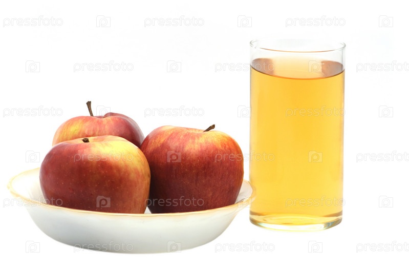 Три яблока в тарелке и сок крупным планом