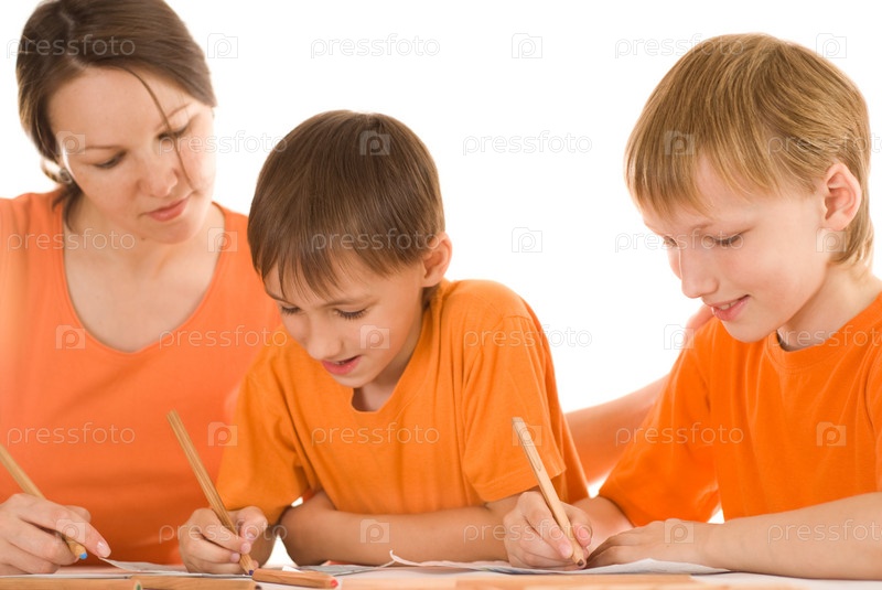 Мать с сыновьями сидит за столом. Дети рисуют карандашами