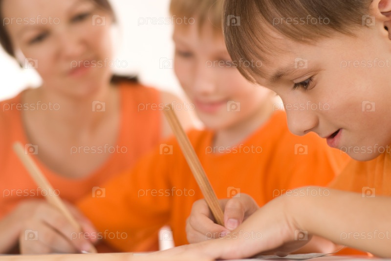 Мать с сыновьями сидит за столом. Дети рисуют карандашами