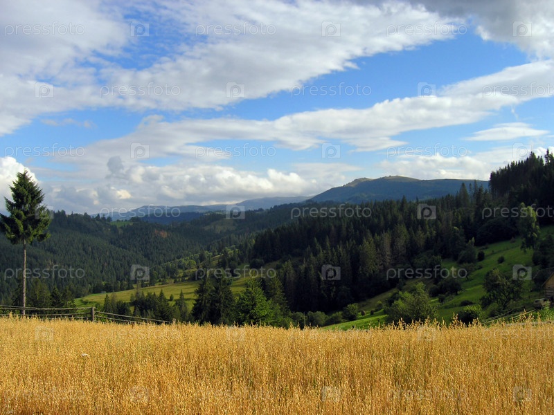 Горный пейзаж с полем ячменя на переднем плане