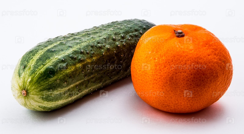 Зеленый огурец и мандарин на белом фоне