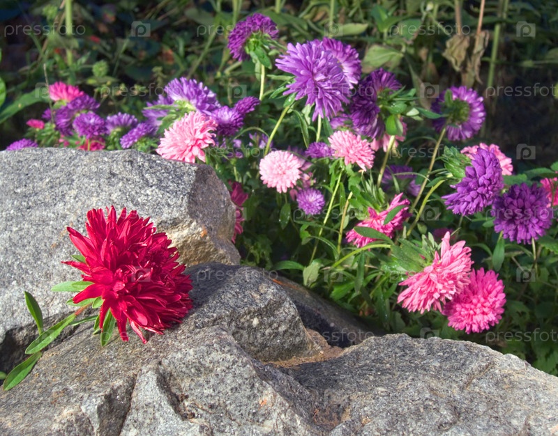 Растущие цветущие астры рядом с камнями