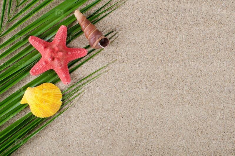 Ракушки, морская звезда и зеленое растение на песке