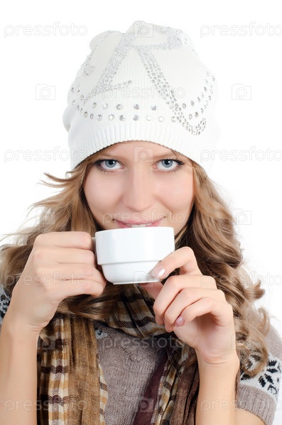 Красивая молодая девушка с чашкой кофе на белом фоне