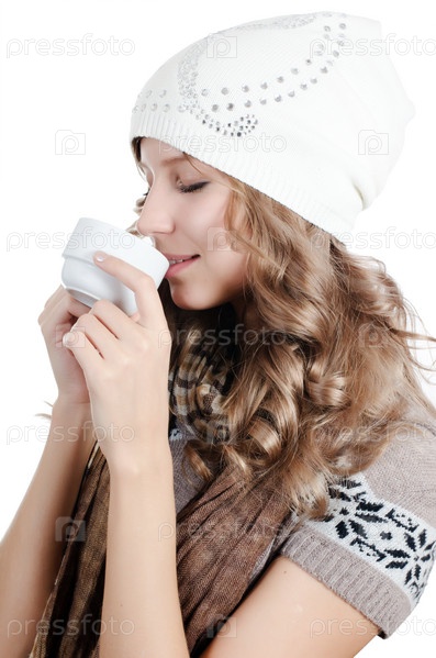 Красивая молодая девушка с чашкой кофе на белом фоне