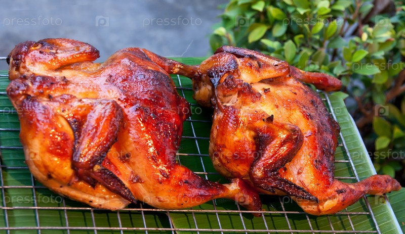 Два жареных цыпленка на пальмовых листьях