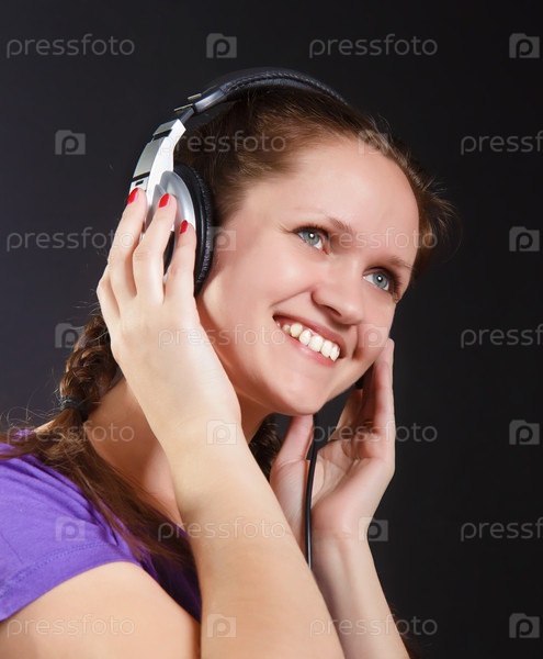 Улыбающаяся девушка в наушниках на черном фоне