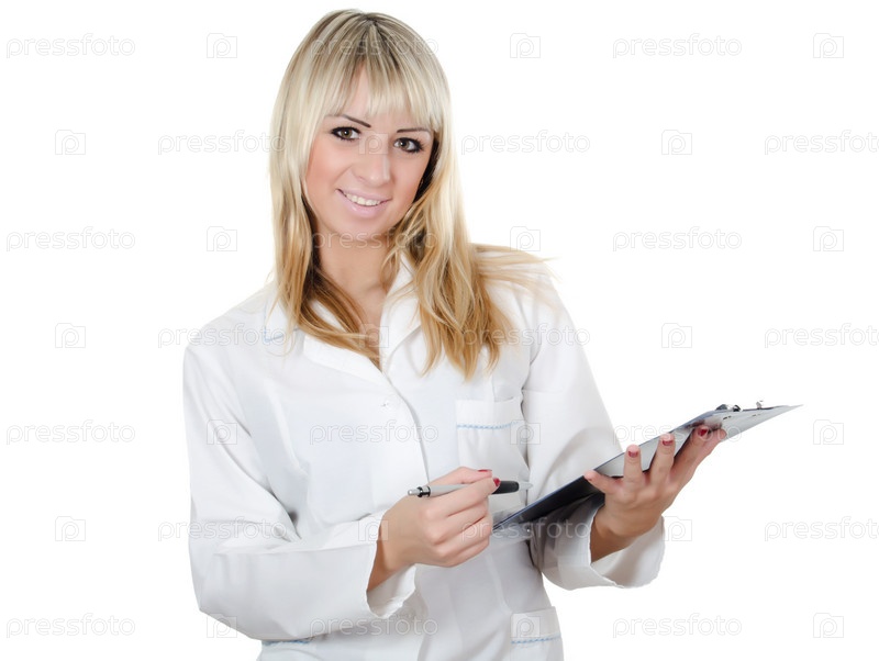 Красивая молодая доктор на белом фоне