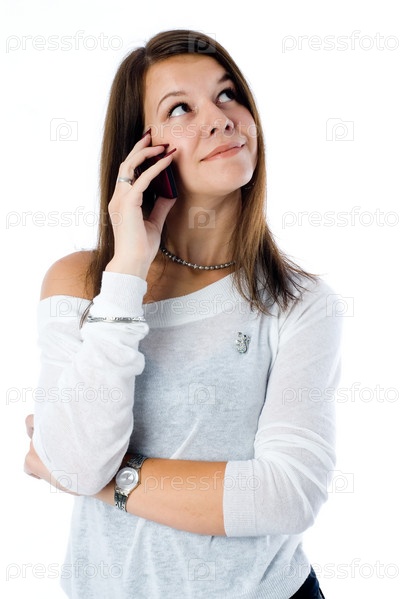 Девушка разговаривает по телефону, изолирована на белом