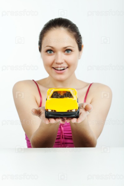 Девушка с игрушечным автомобилем на ладонях