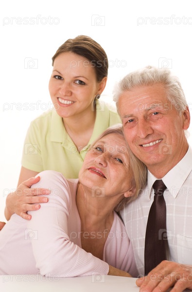 Пожилая пара с дочерью на белом фоне