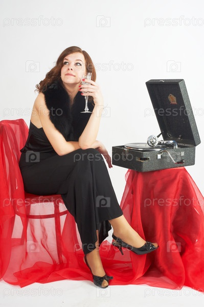 Молодая женщина слушает граммофон