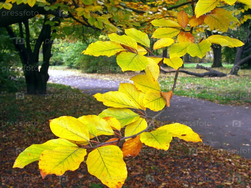 Ветка с желтой листвой в осеннем парке