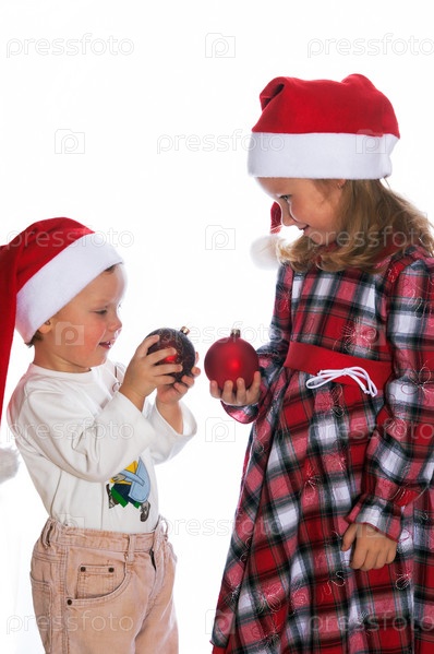 Маленький мальчик и девочка в колпаках и с новогодними игрушками в руках на светлом фоне