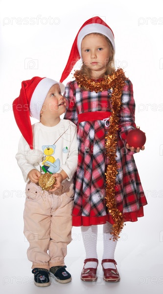 Маленький мальчик и девочка в колпаках и с новогодними игрушками в руках на светлом фоне