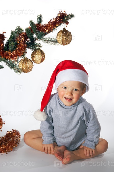 Маленький мальчик сидит под елкой на светлом фоне