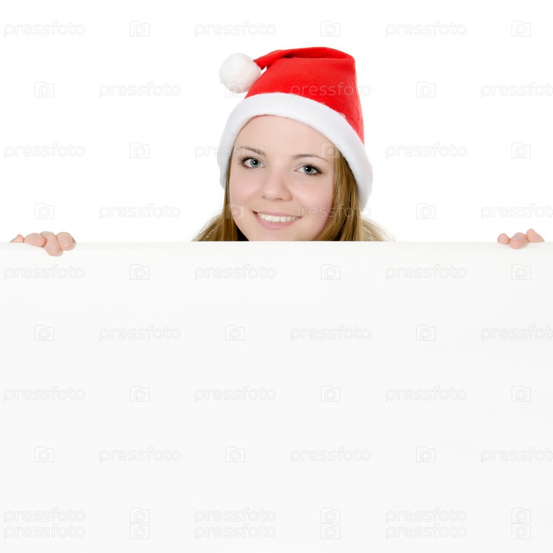 Девушка в новогоднем колпаке с пустым плакатом