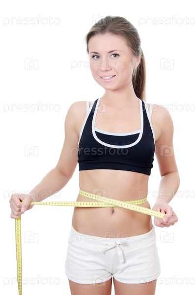 Портрет красивой молодой девушки с сантиметром на белом фоне