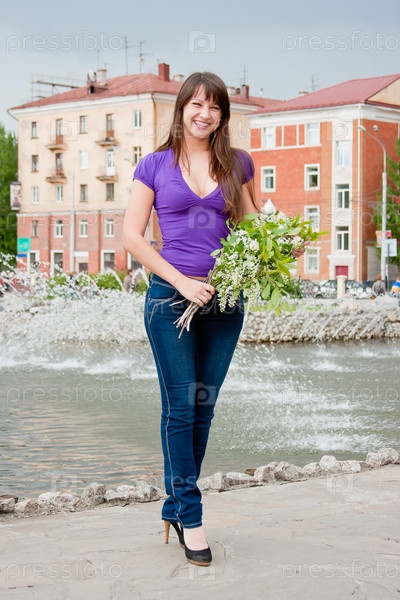 Девушка с букетом цветущей черемухи