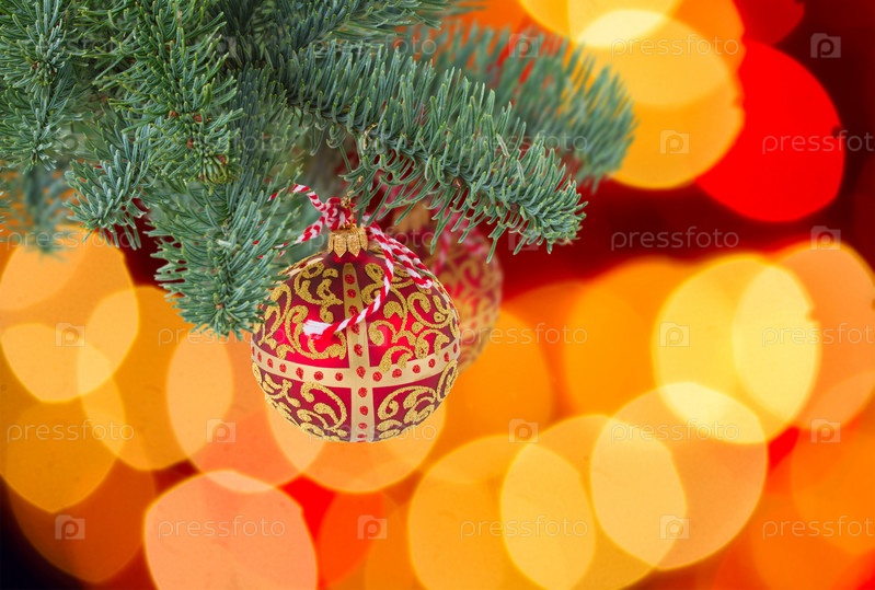 Елочный шар висит на ветке ели