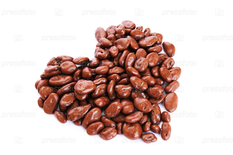 Изюм в шоколаде,выложенный в форме сердца, изолированный на белом фоне