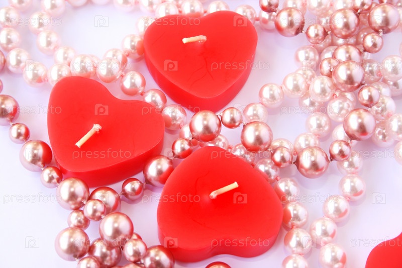 Красные свечи в форме сердца и ожерелье, изолированные на белом фоне