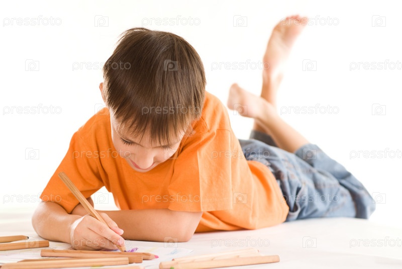 Мальчик, рисующий карандашами лежа на полу, изолированный на белом фоне