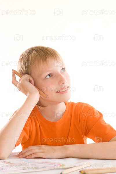Портрет мальчика, рисующего карандашом, изолированный на белом фоне