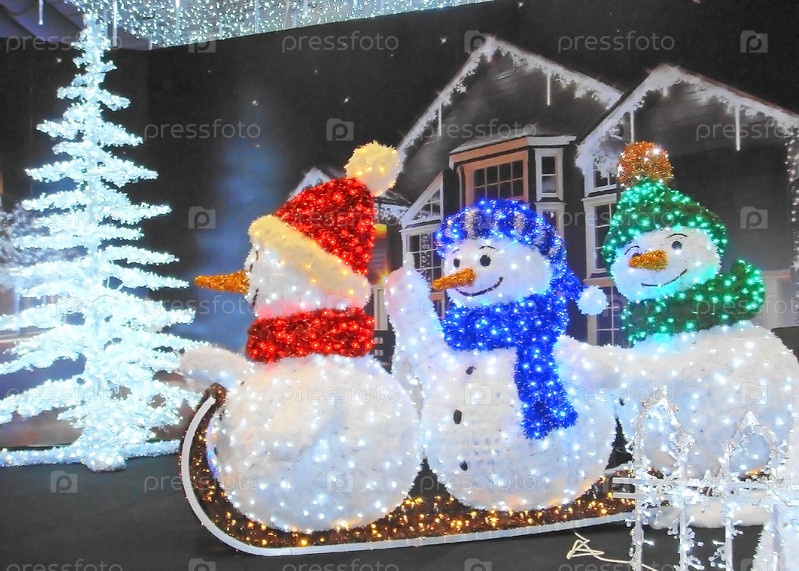 Три светящихся новогодних снеговика на санях и елка