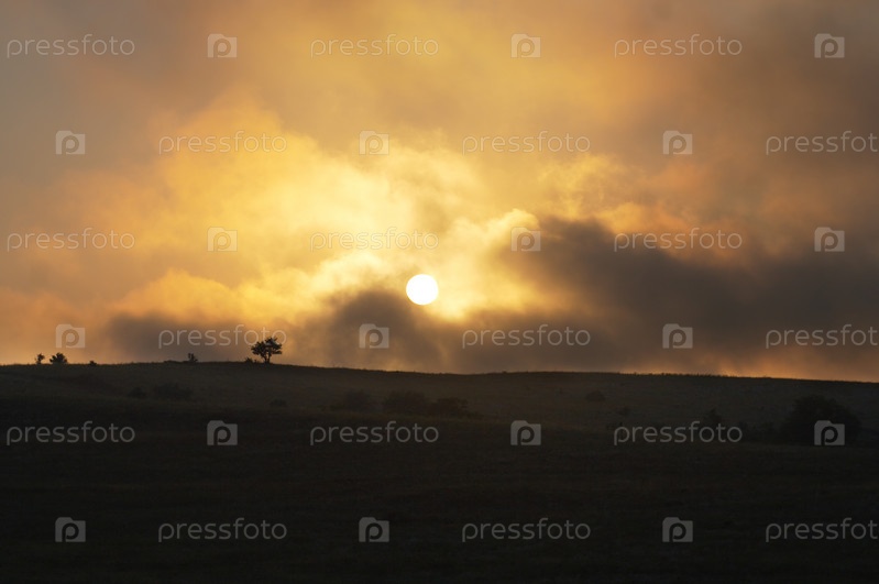 Пасмурный закат над холмами прерии летом с одиноким деревом на вершине (темно желтого тона)