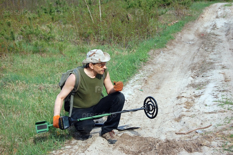 Мужчина с металлодетектором у дороги