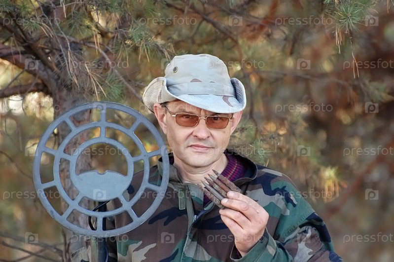 Мужчина с металлодетектором и старой обоймой патронов к немецкому карабину "маузер"