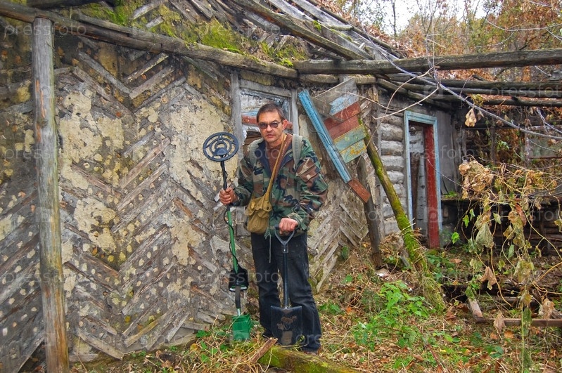 Мужчина с металлодетектором у полуразрушенного деревянного дома